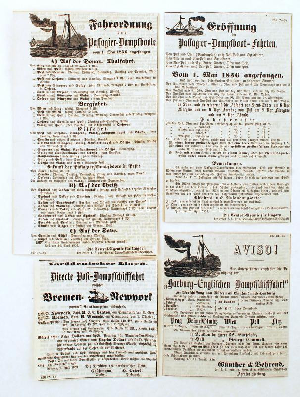 1856 3 db gőzhajózással kapcsolatos újságkivágás, a Pest-Buda és Újpest-Szentendre vonalon való gőzhajó járat elindításáról, New York, Bréma, Duna, Tisza útvonalakról német nyelven