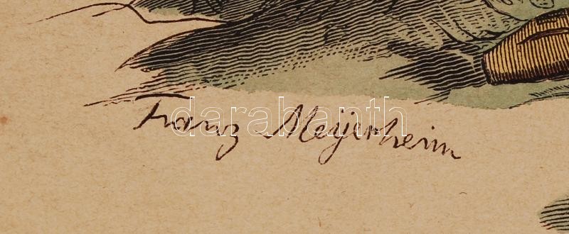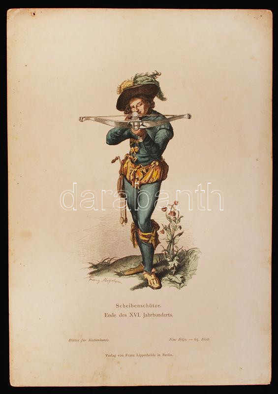 1887 Scheibenschütze. Ende des Jahres XVI. Jahrhunderts. Színezett fametszet a Blatter für Kostumkunde c. könyvből. Jelzett a metszetn. 28,5x20cm / Washers protecter from end of XVI. century. Colored wood engraving. Signed on the engraving.