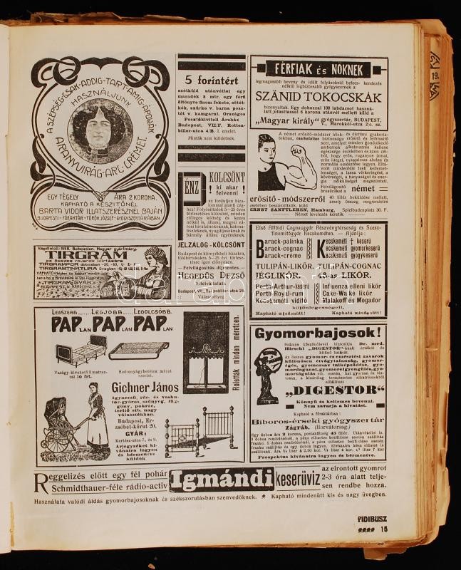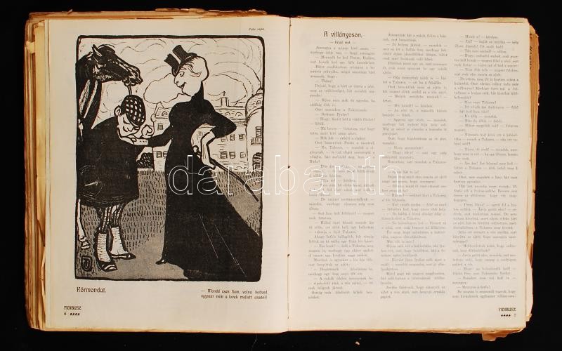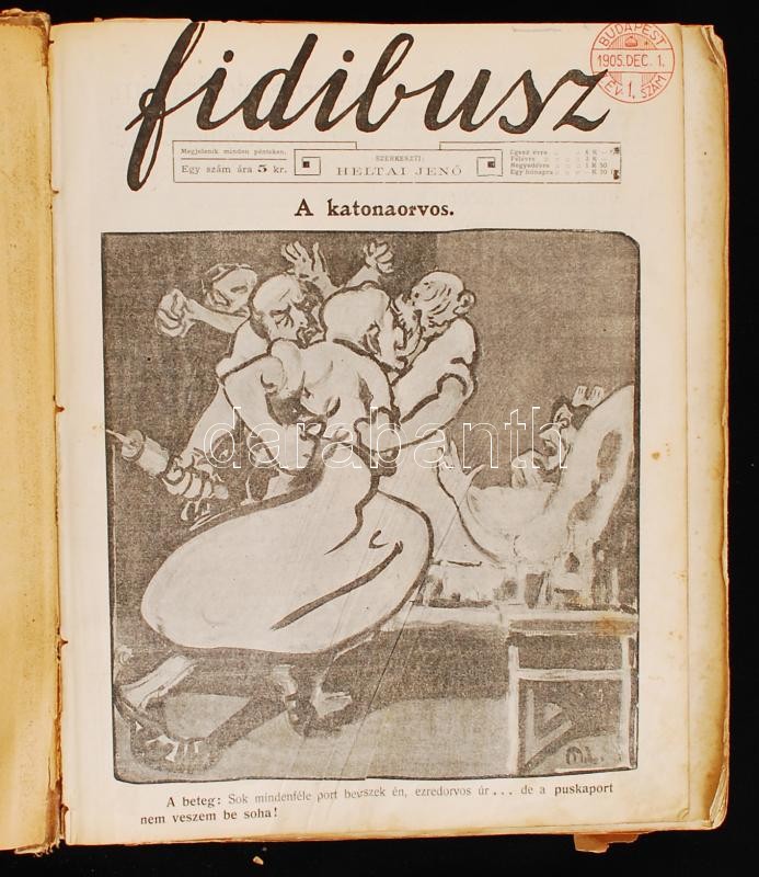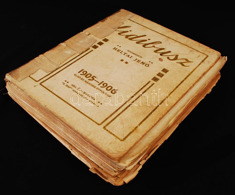 1905-1906 Fidibusz. Szerkeszti Heltai Jenő. I-II. évfolyam, 52 szám. Gazdagon illusztrált, erotikus élclap. A szerzők között találjuk Kosztolányi Dezső és Molnár Ferenc nevét is. A rajzok alkotói között pedig Faragó Géza, Kober Leó, Márk Lajos, Paulini Béla és Vadász Miklós is szerepel. Kiadói félvászon kötésben, egybekötve. Néhány oldal ill. a gerinc sérült.
