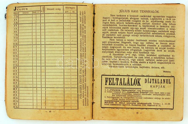 1926 Méhésznaptár. (Görög Ernő szer.) A kötet végén nagyon sok - szakmatörténeti szempontból érdekes - hirdetés található. Egészvászon kötésben. Fedőlap rossz állapotú, ceruzás bejegyzésekkel.