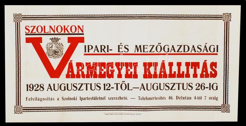 1928 A szolnoki Ipari és Mezőgazdasági Vármegyei Kiállítás plakátja, 6... https://www.darabanth.com/de/223-Fernauktion/223.0/Andere-Sammelgebiete/Drucksachen~7/1928-A-szolnoki-Ipari-es-Mezogazdasagi-Varmegyei-Kiallitas-plakatja-62x32-cm~II970794