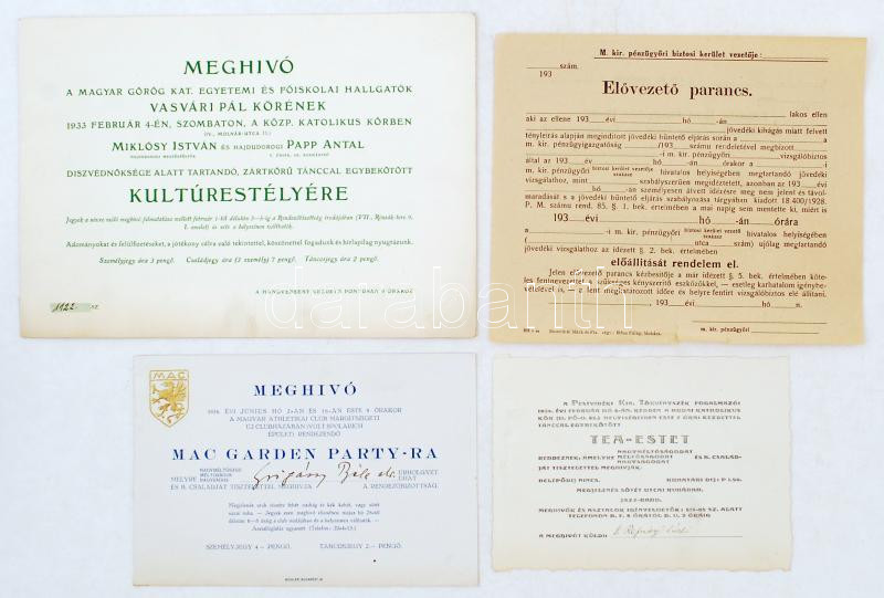 1933-1934 3 db régi meghívó(Pestvidéki Kir. Törvényszék teaestje, Magyar Athletikai Club mac garden party, Magyar Görög Kat. Egyetemi és Főiskolai Hallgatók Vasvári Pál Körének kultúrestélye), 1 db m.kir. pénzügyőri biztosi kerület vezetője által kiadott kitöltetlen elővezető parancs