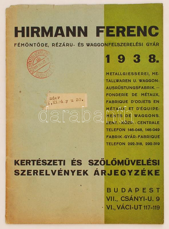 1938 Bp., Hirmann Ferenc fémöntöde, rézáru- és vagonfelszerelési gyárá... https://www.darabanth.com/de/223-Fernauktion/223.0/Andere-Sammelgebiete/Drucksachen~7/1938-Bp-Hirmann-Ferenc-femontode-rezaru-es-vagonfelszerelesi-gyaranak-kerteszeti-es-s~II970803
