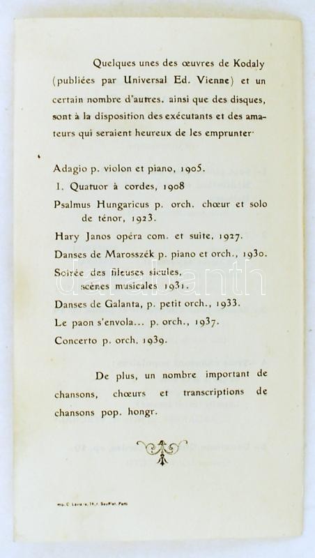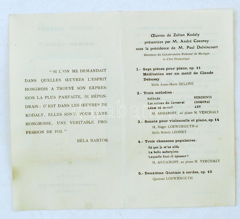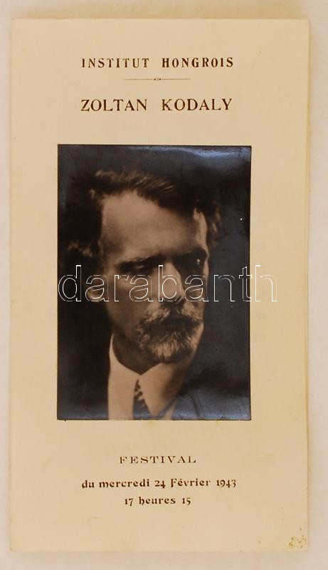 1943 Institut hongrois, Zoltan Kodaly festival du mercredi 24 février 1943, a Párizsi Magyar Intézet meghívója a Kodály-estre, Kodály Zoltán fényképével