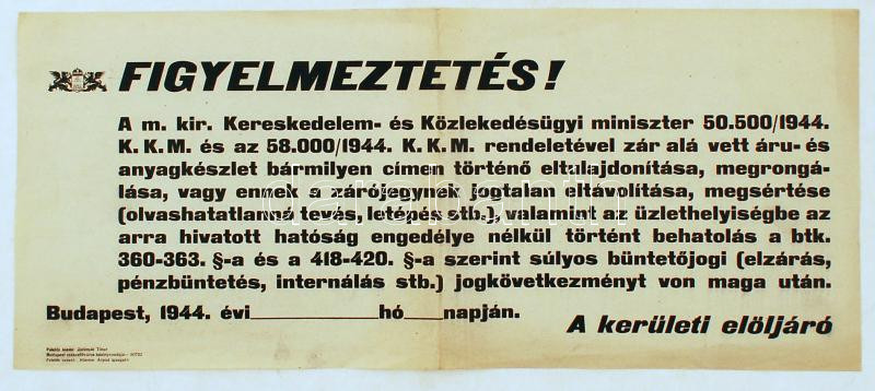 1944 Bp., A m. kir. kereskedelem- és közlekedésügyi miniszter által kiadott figyelmeztetés, melyben megtiltja a zár alá vett áru-és anyagkészlet bármilyen címen történő