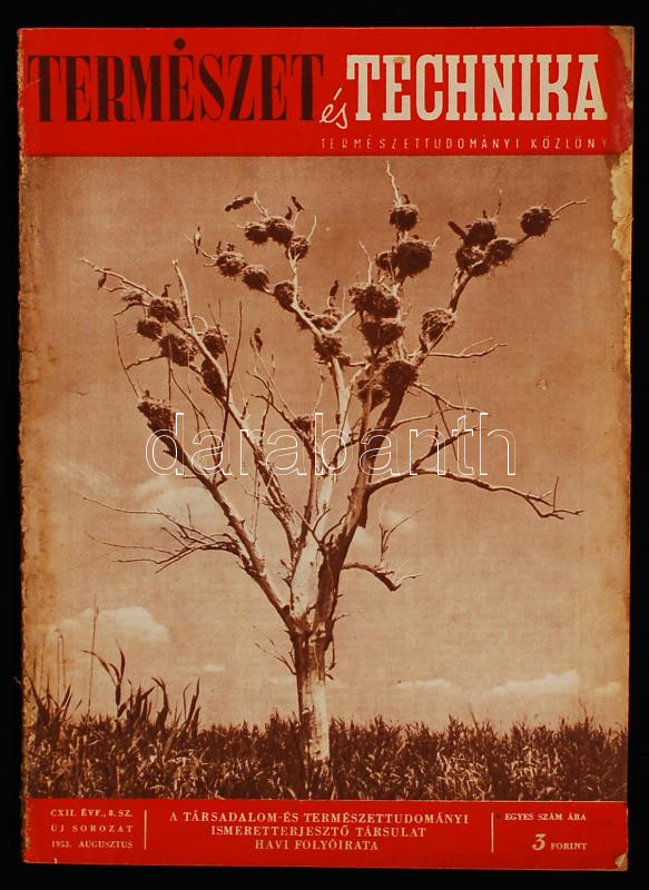 1953 a Természet és technika ismeretterjesztő természettudományi közlöny 112. évf. 8. száma, érdekes írásokkal a természettudományok, történelem és az irodalom területéről.