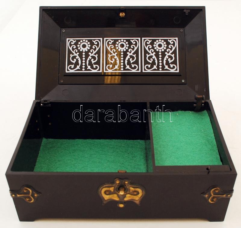 Fekete zenedoboz, műanyag, réz díszítéssel, működik, 21×12,5×8 cm https://www.darabanth.com/de/223-Fernauktion/223.0/Andere-Sammelgebiete/Flohmarkt~27/Fekete-zenedoboz-muanyag-rez-diszitessel-mukodik-21C39712-5C3978-cm~II966442