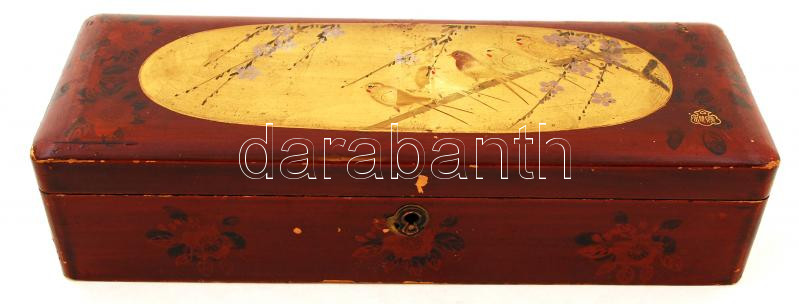 Beschreibung: Lakkozott kínai fadoboz, fedelén madaras díszítéssel, az alján lepattanásokkal, jelzett, 30×10,5×7,5 cm