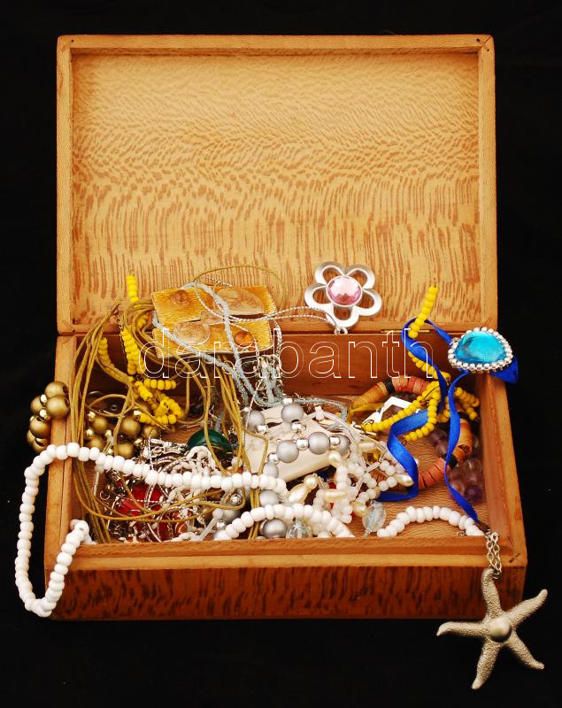 Beschreibung: Nagy bizsu tétel: különféle karkötők, nyakláncok 19,5×13,5×5,5 cm-es fa dobozban