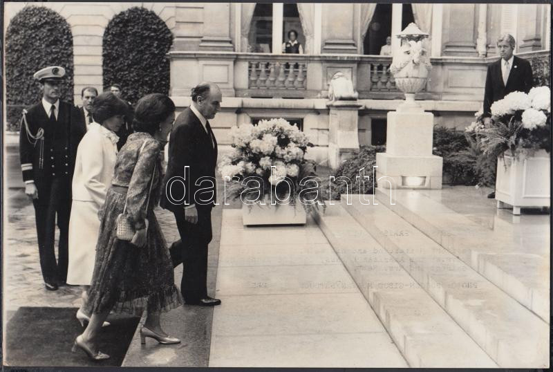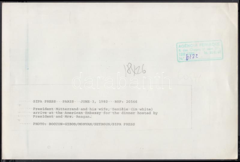 1982 Mitterand elnök és felesége érkezik az elnökhöz és Mrs Reaganhez vacsorára. Párizs. Jelzett: Boccon-Gibod/Morvan/Setboun/Sipa Press 17,5x26,5cm / President Mitterand and his wife arrive at the American Embassy for the dinner hosted by President and Mrs Reagan. Signed: Boccon-Gibod/Morvan/Setboun/Sipa Press 17,5x26,5cm