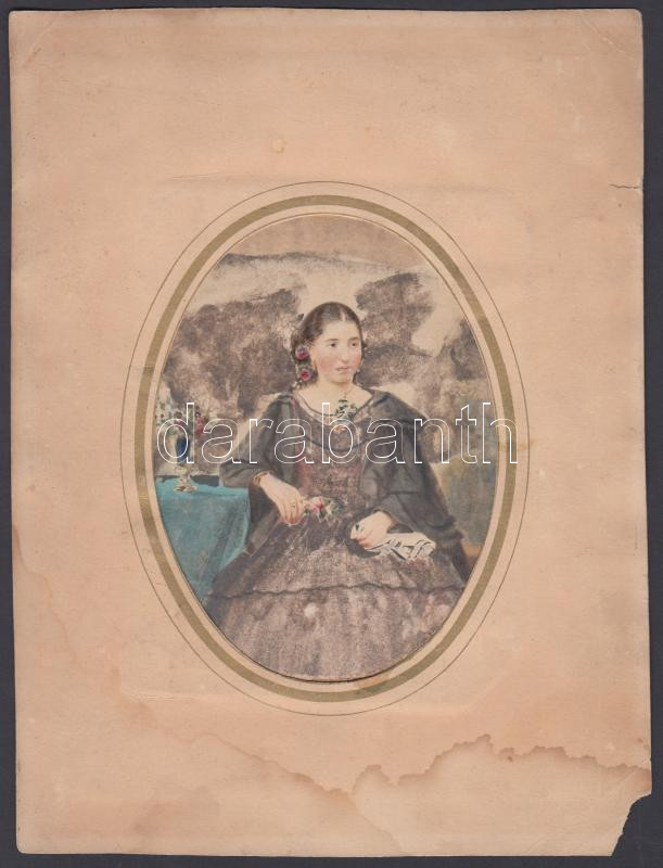 cca 1850-1860 Női portré, korai fénykép, erősen átfestve, kontúrvonalak megerősítve, vékony (vízfoltos) paszpartuban, képméret 14x10 cm, karton 24x18 cm