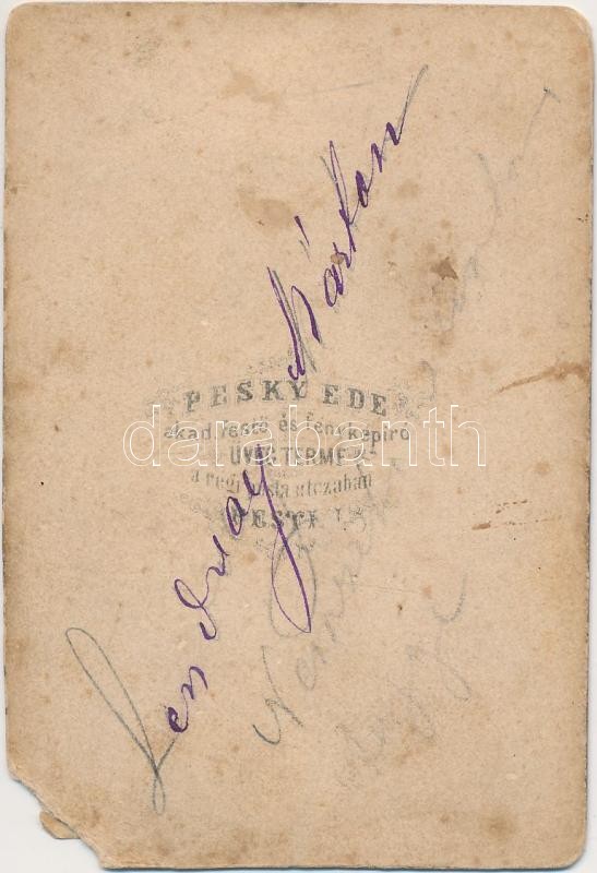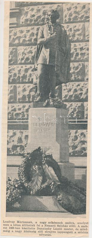 cca 1855 Lendvay Márton (1807-1858) színész, a Nemzeti Színház tagja, fotóábrázolás eddig – tudomásunk szerint – nem került elő róla, vagy csak nagyon kevés, ez a kép vizitkártya méretű, keményhátú fotó Pesky Ede műterméből (Pest), a sarka hiányzik, feliratozott, 9,5x6,5 cm, + hozzáadva egy újságkivágást a színész szobráról