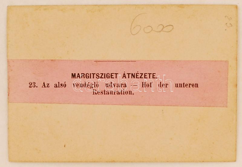 Beschreibung: cca 1880 Bp., Klösz György: A Margitsziget átnézete, az alsó vendéglő udvara, keményhátú fotó, feliratozva, jelzett, 10x7 cm