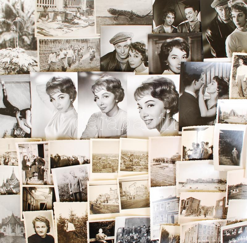 cca 1900-1950 Nagy fotó tétel: 123 db különféle fénykép vegyesen: családi fényképek, szÃnházi műtermi fotók, sok német vonatkozású katonai fotó a II. világháború idejébÅ‘l katonákról, a megszállt területekrÅ‘l (pl. Lengyelország, minszki botanikus kert), lebombázott épületekrÅ‘l, stb.; egy része a hátulján feliratozva, különbözÅ‘ formátumokban