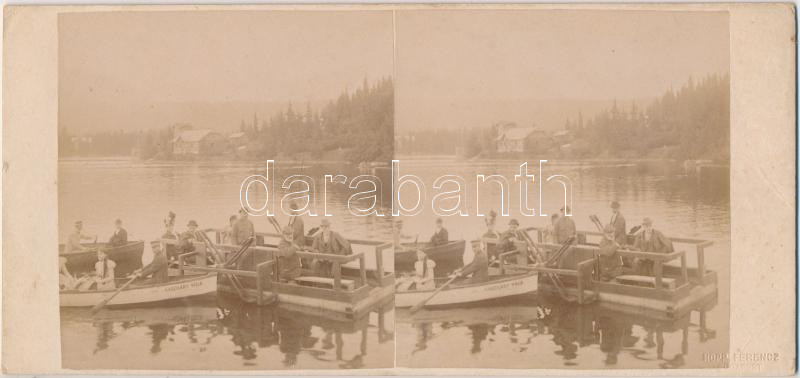 Beschreibung: cca 1900 Hopp Ferenc (1833-1919): Laszkáry villa csónakázó vendégei, hideg pecséttel jelzett sztereo fényképpár kartonra ragasztva, 8x17 cm