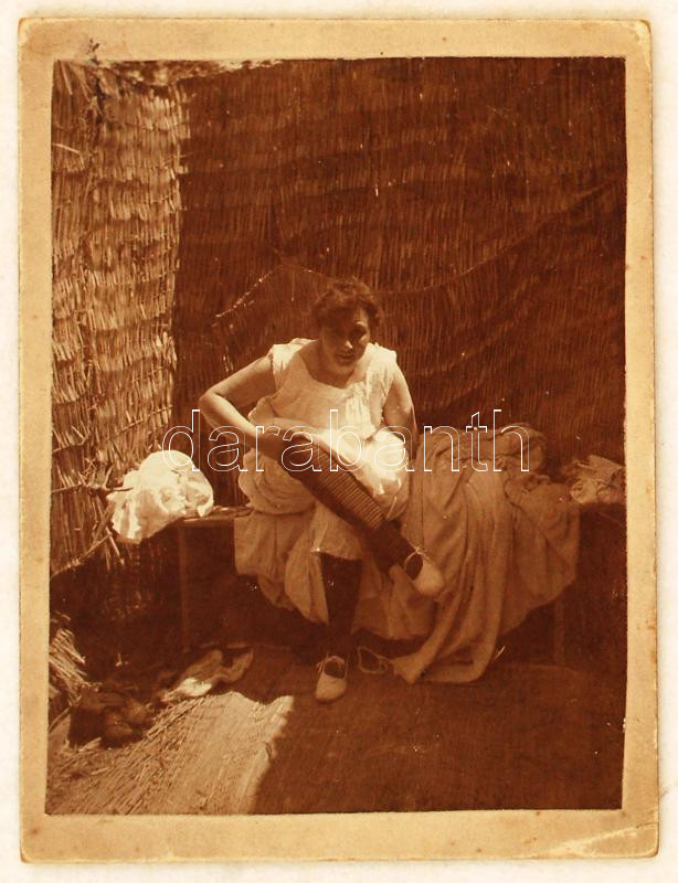 Beschreibung: cca 1900 Öltözködés közben, kartonra kasírozott fotó, 8x10 cm