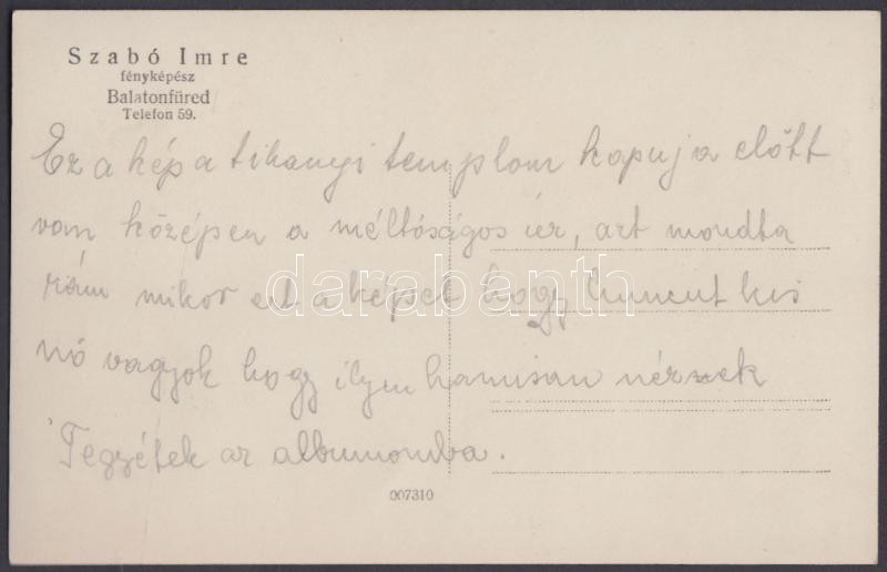 cca 1930 Szabó Imre balatonfüredi fényképész felvétele a tihanyi templ... https://www.darabanth.com/de/223-Fernauktion/223.0/Andere-Sammelgebiete/Foto~34/cca-1930-Szabo-Imre-balatonfuredi-fenykepesz-felvetele-a-tihanyi-templom-kapujaban-tulajdono~II966637