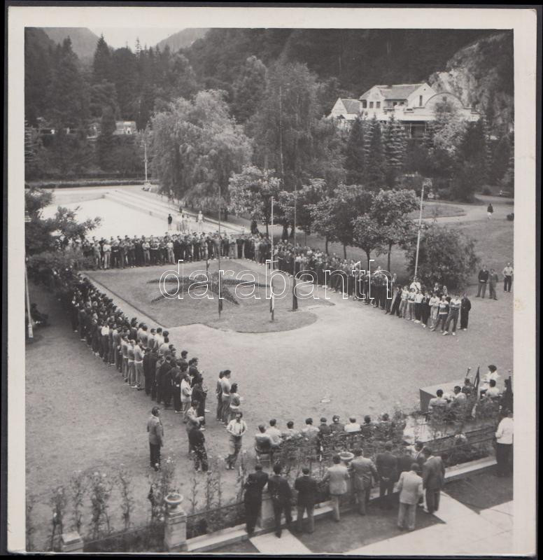 Beschreibung: cca 1950 Etényi-Pobuda Sportfotó Munkaközösség: Sport tábor Lillafüreden, publikálva a Sport és Testnevelésben, pecséttel jelzett, feliratozott, 12x12 cm