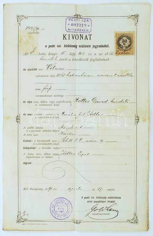 Beschreibung: 1891 Bp., Kivonat a pesti izraelita hitközség születési jegyzékéből, pecséttel, 50 kr okmánybélyeggel