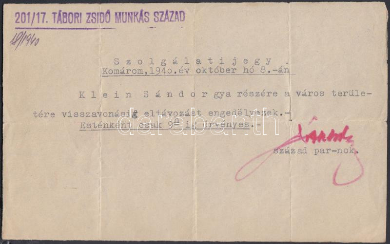 1940 Tábori zsidó munkás század század parancsnokának eltávozási enged... https://www.darabanth.com/de/223-Fernauktion/223.0/Andere-Sammelgebiete/Judaica~38/1940-Tabori-zsido-munkas-szazad-szazad-parancsnokanak-eltavozasi-engedelye-estenkent-9-i~II972952