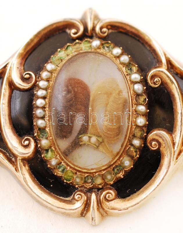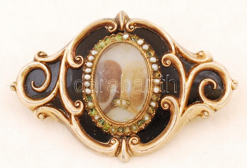 Beschreibung: Aranyozott ezüst(Ag) antik angol (1869.) zománccal díszített, gravírozott bross, hiányos igazgyöngy berakással, 5x3 cm, jelzett, br: 16 g