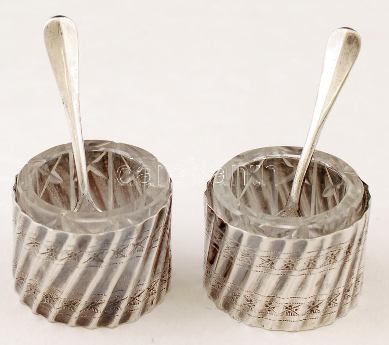 Beschreibung: Ezüst(Ag) fűszertartó ezüst (Ag) kanalakkal, jelzett, üveg betétekkel, egyik sérült, 50,7 g