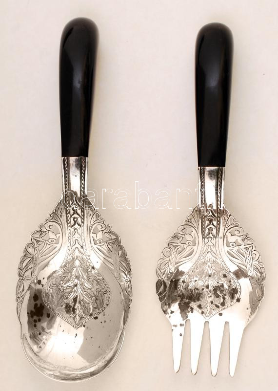 Beschreibung: Gazdagon díszített ezüst (Ag) salátakeverő villa és kanál ébenfa nyéllel, foltos, jelzett, br: 234 g