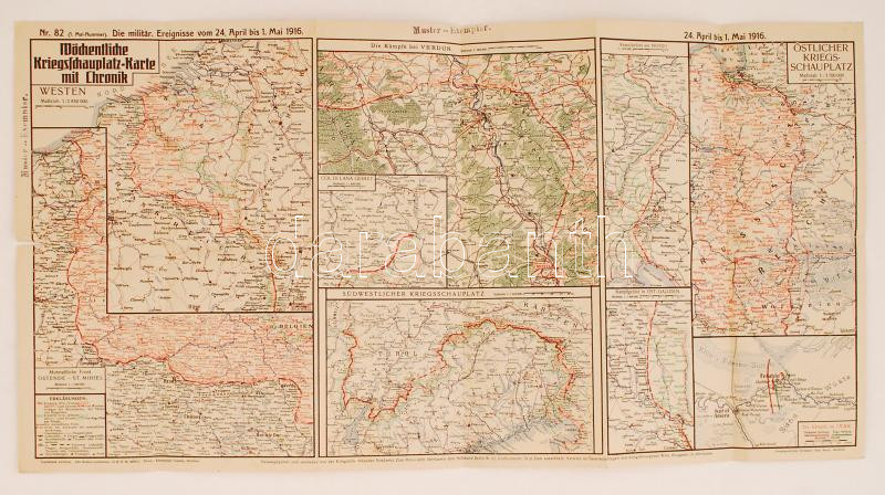 1916 május katonai térkép német nyelvű krónikával. Kiadó: Kriegshilfe München Nordwest. 1:735.000 Hajtogatva. 34x65,5cm /Front map 1916 with German-language chronicle