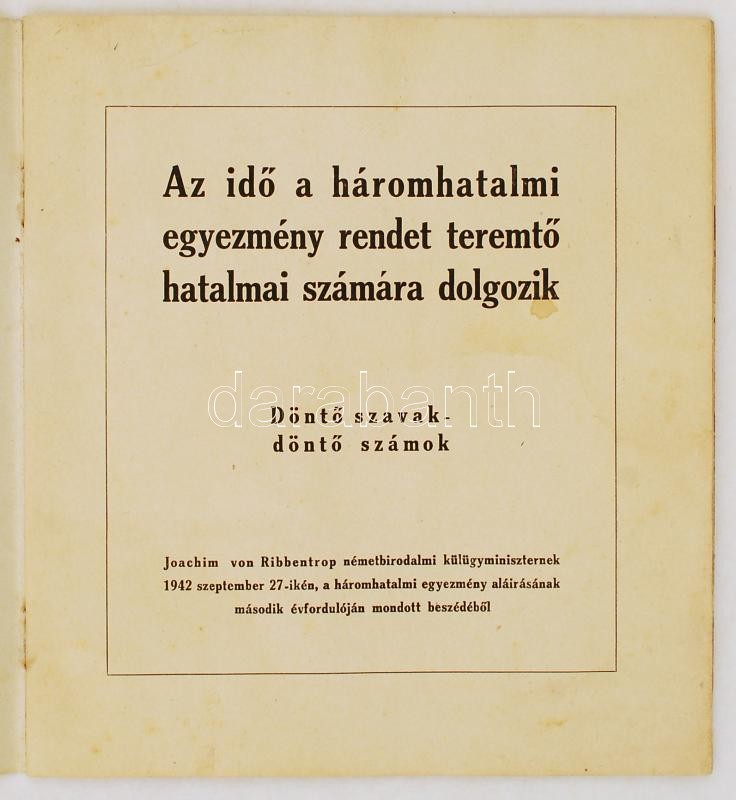 1942 Biztos a győzelem! Döntő szavak-döntő számok, Joachim von Ribbentrop német birodalmi külügyminiszternek 1942. szeptember 27-ikén, a háromhatalmi egyezmény aláírásának második évfordulóján mondott beszédéből, fotókkal illusztrált