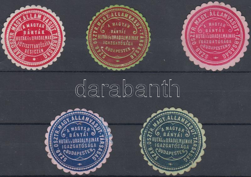 Beschreibung: Szabad Osztrák-Magyar Vasút Társaság, Magyar bányák igazgatósága Budapest és Resica 5 db pecsétbélyeg