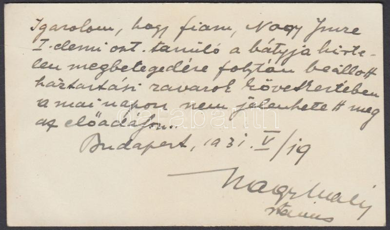 Beschreibung: 1931 Nagy Valér rendőrtanácsos saját kézzel megírt és aláírt sorai
