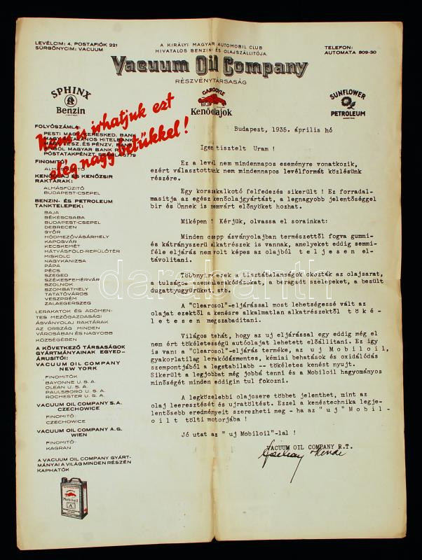 1935 Vacum Oil Company Részvénytársaság a Királyi Magyar Automobil Clu... https://www.darabanth.com/de/223-Fernauktion/223.0/Andere-Sammelgebiete/Werbungen~35/1935-Vacum-Oil-Company-Reszvenytarsasag-a-Kiralyi-Magyar-Automobil-Club-Hivatalos-Benzin-es-O~II960302