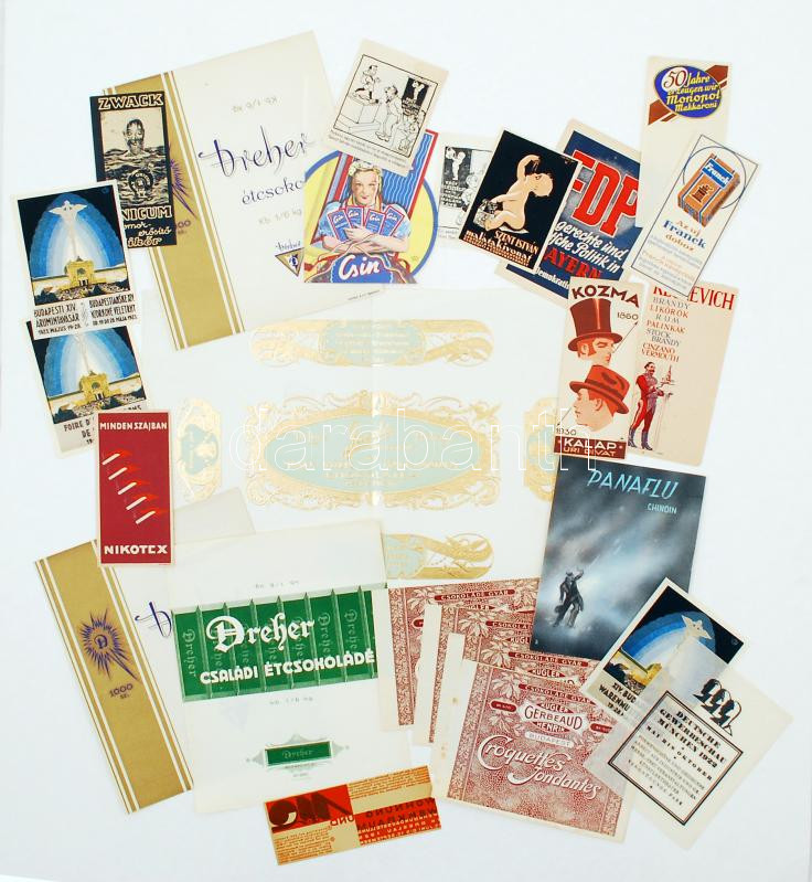 Háború előtti reklám címkék cca 20db, különböző méretben. https://www.darabanth.com/de/223-Fernauktion/223.0/Andere-Sammelgebiete/Werbungen~35/Haboru-elotti-reklam-cimkek-cca-20db-kulonbozo-meretben~II966280