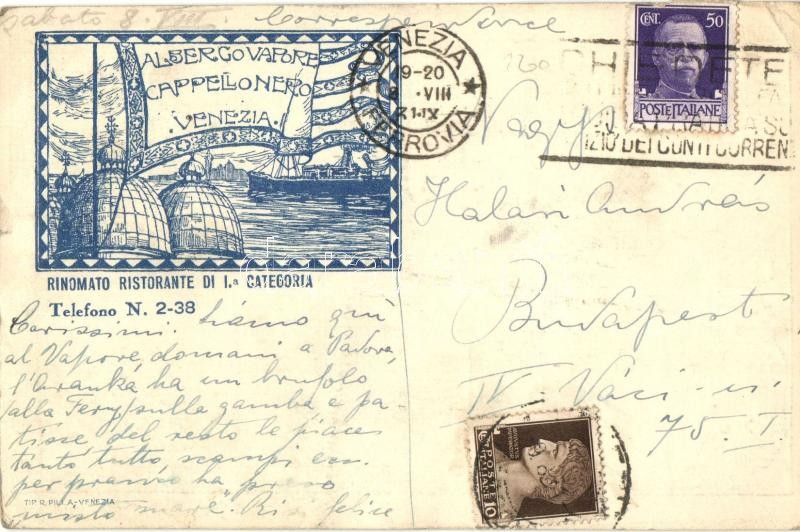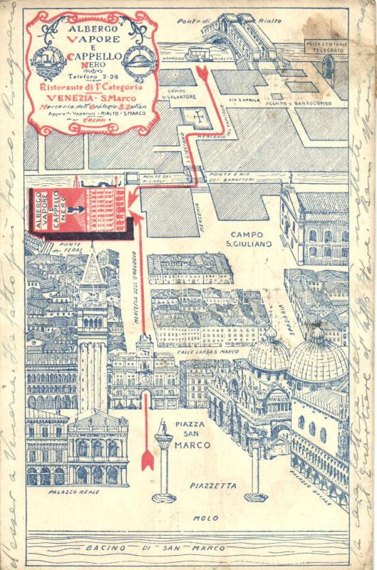 Venice, Venezia; Albergo Vapore e Cappello Nero / hotel, restaurant, a... https://www.darabanth.com/de/223-Fernauktion/223.0/Ansichtskarten/Italien~40423/Venice-Venezia-Albergo-Vapore-e-Cappello-Nero-hotel-restaurant-advertisement-map-small-tear~II972650