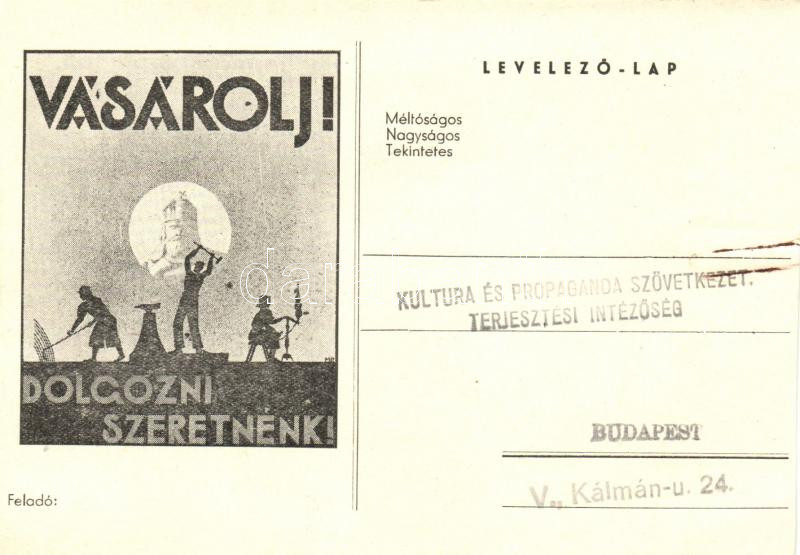 Vásárolj! Dolgozni szeretnénk! Kultúra és Propaganda Szövetkezet Terje... https://www.darabanth.com/de/223-Fernauktion/223.0/Ansichtskarten/Propaganda~40398/Vasarolj-Dolgozni-szeretnenk-Kultura-es-Propaganda-Szovetkezet-Terjesztesi-Intezoseg-lap~II972091