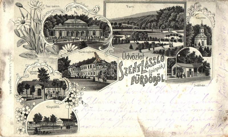 Beschreibung: Püspökfürdő (Szentlászlófürdő) Indóház, vasútállomás, Lőrincz fürdő, Népszálló, kiadja Helyfi László / railway station, spa, hotel, floral Art Nouveau litho (EK)