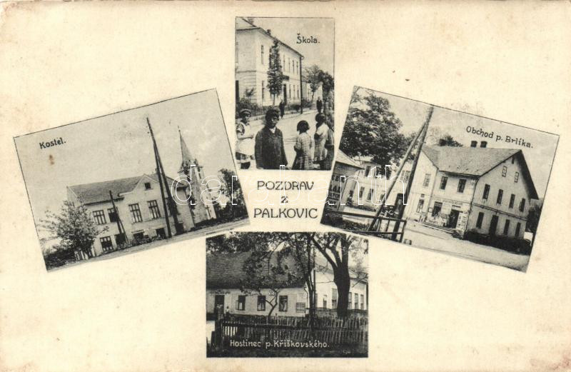 Beschreibung: Palkovice, Skola, Kostel, Obchod p. Brlíka, Hostinec p. Kriskovského / school, church, shop, restaurant (EK)