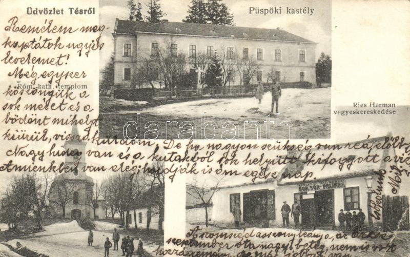 Tés, Püspöki kastély, Római katolikus templom, Ries Herman vegyeskeres... https://www.darabanth.com/de/223-Fernauktion/223.0/Ansichtskarten/Ungarn~20006/Tes-Puspoki-kastely-Romai-katolikus-templom-Ries-Herman-vegyeskereskedese-Fekete-Zoltan-f~II966669