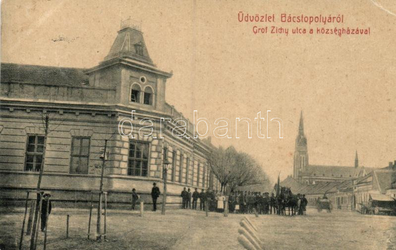 Beschreibung: Bácstopolya, Gróf Zichy utca, Községháza, kiadja Wilhelm Miksa / street, town hall (EK)