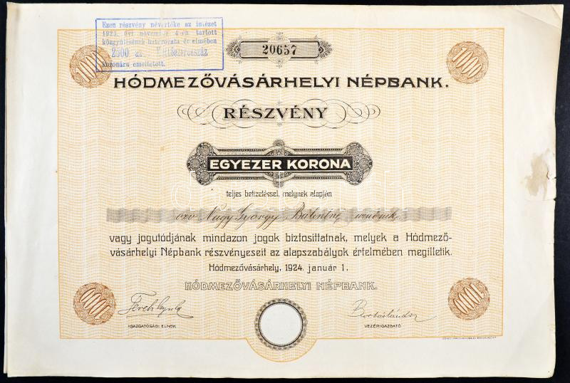 Hódmezővásárhely 1924. "Hódmezővásárhelyi Népbank" részvénye 1000K-ról... https://www.darabanth.com/de/223-Fernauktion/223.0/Numismatik/Aktien-und-Tickets~10006/Hodmezovasarhely-1924-Hodmezovasarhelyi-Nepbank-reszvenye-1000K-rol-szelvenyekkel-~II973353