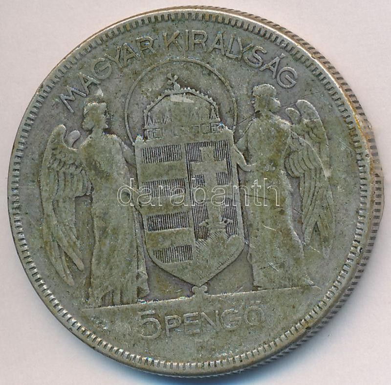 Beschreibung: 1930. 5P Ag "Horthy jobbra" T:3 ragasztónyom