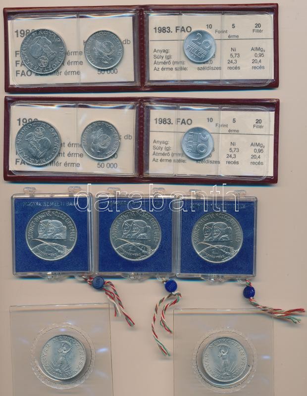 Beschreibung: 1980. 100Ft "Szovjet-magyar közös űrrepülés" (2x) eredeti plombált MNB plasztiktokban + 1981. 10Ft "FAO" (2x) eredeti vákuumcsomagolásban + 1983. 20f + 5Ft + 10Ft + 100Ft "FAO" (2x) eredeti tokban, tanúsítvánnyal T:BU,1
