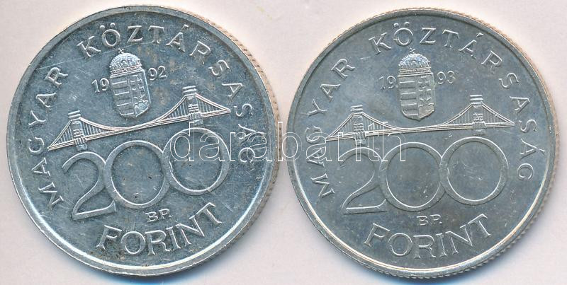 1992-1993. 200Ft Ag "MNB" (2x) T:2,2- https://www.darabanth.com/de/223-Fernauktion/223.0/Numismatik/Ungarische-Munzen~10009/1992-1993-200Ft-Ag-MNB-2x-T2-2-~II972721