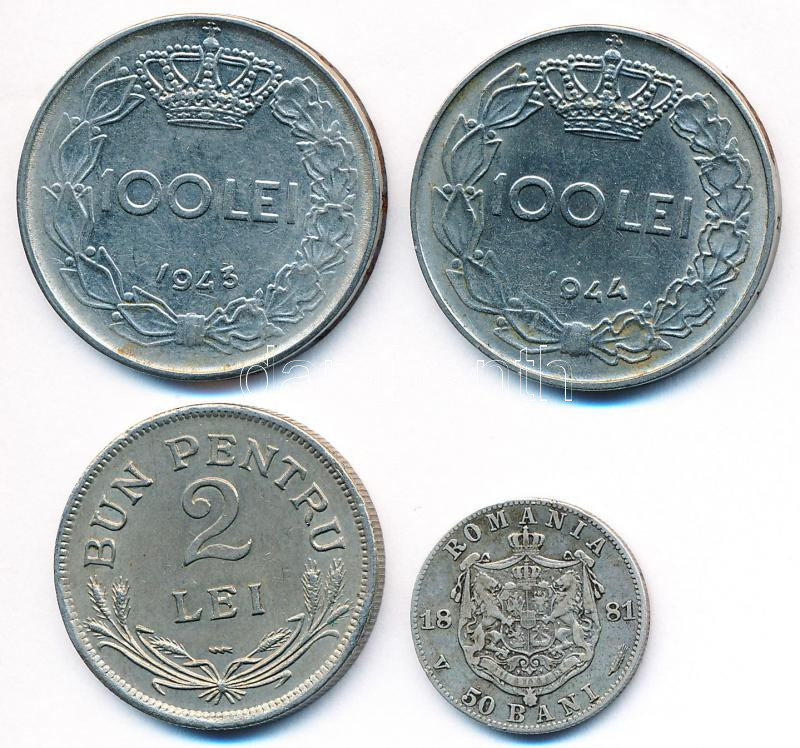 Romania 1881V 50 Bani Ag "Carol I" + 1924. 2 Lei Cu-Ni + 1943-1944. 100 Lei CCS (2x) C:XF,VF
