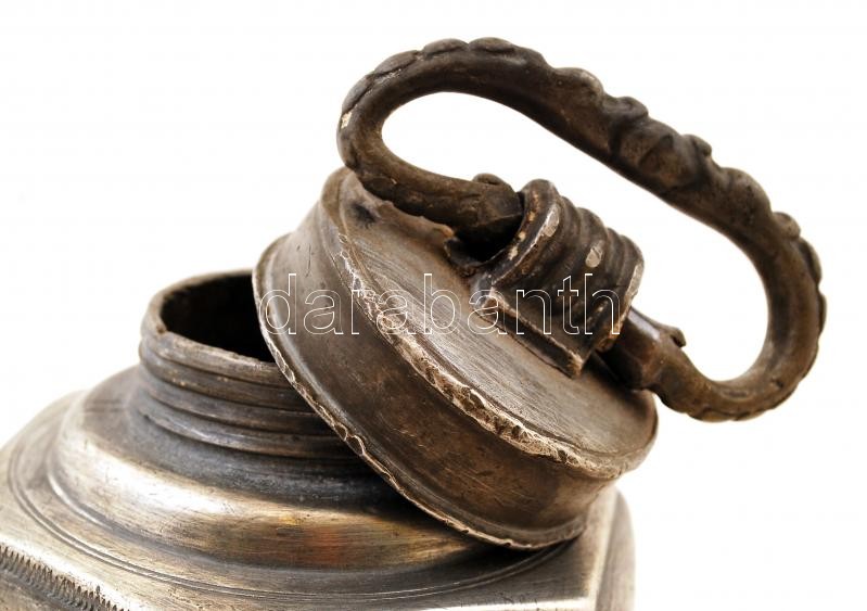 Beschreibung: Antik ón gyömbértartó csavaros fedéllel, M.H. 1815. gravírozással, horpadással, m: 25 cm