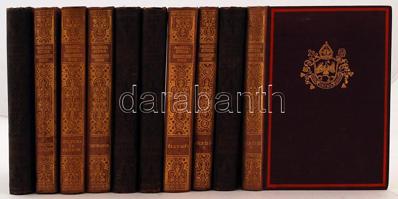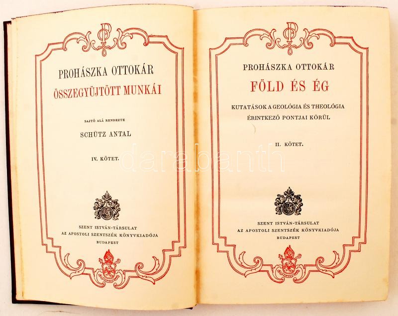 Prohászka Ottokár Összegyűjtött munkái I., III., IV., V., VIII., X., XI., XII., XIII. és XVI. kötete: Isten és a világ. Missziós levelek; Föld és ég. Kutatások a geológia és theológia érintkező pontjai körül. 1-2. köt.; A diadalmas világnézet; Magasságok felé; Korunk lelke; Kultúra és terror. A társadalmi kérdés; Ünnepnapok. Emlékezések; Élet igéi. Beszédek; Utak és állomások. Bp., 1927-1928, Szent István Társulat. Kopottas gerincű, aranyozott vászonkötésben, kötetenként változó, de nagyrészt jó állapotban.