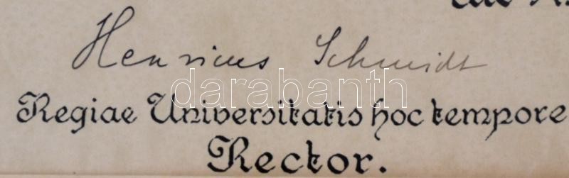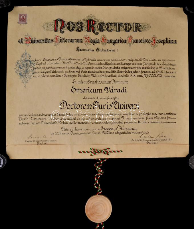1872 Szeged, a Ferenc József Tudományegyetem jogi doktori kinevezési oklevele, az egyetem rektorának és a jogi kar dékánjának aláírásaival, piros-fehér-zöld sodraton befüggesztett fa tokos függőpecséttel, jó állapotban, saját tokjában