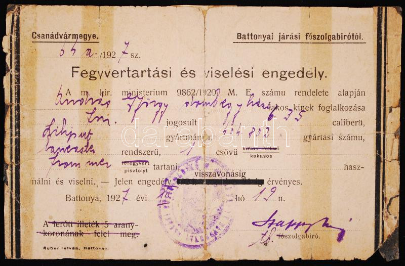 1927 Csanád vármegye fegyvertartási és viselési engedély megviselt ál... https://www.darabanth.com/de/224-Fernauktion/224.0/Andere-Sammelgebiete/Dokument~27/1927-Csanad-varmegye-fegyvertartasi-es-viselesi-engedely-megviselt-allapotban~II643186