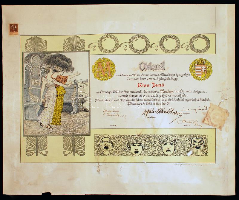1931-1932 a Magyar Királyi Színművészeti Akadémia 2 db díszes oklevele rendezői, illetve színművészeti tanfolyam elvégzéséről, szárazpecséttel, aláírásokkal, vörös-arany-fekete szalaggal átkötve