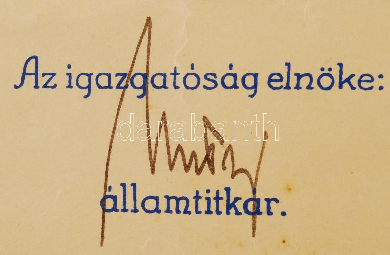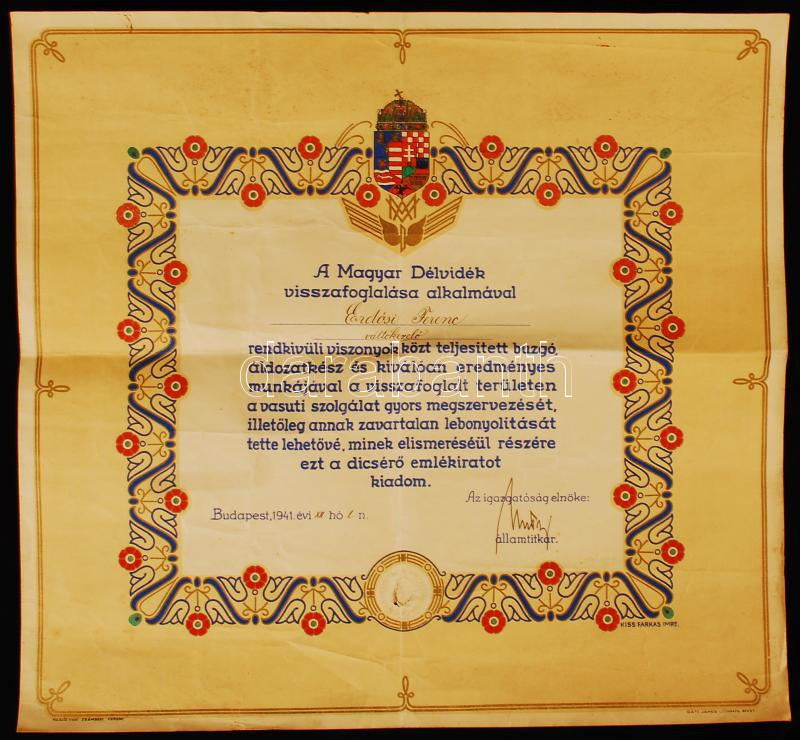 1941 A Magyar Délvidék visszacsatolása során a vasúti közlekedés megszervezéséért adott elismerő MÁV oklevél vasutas részére / Warrant for railway worker after the occupation of the Banat 40x40 cm